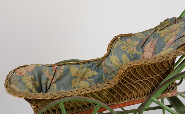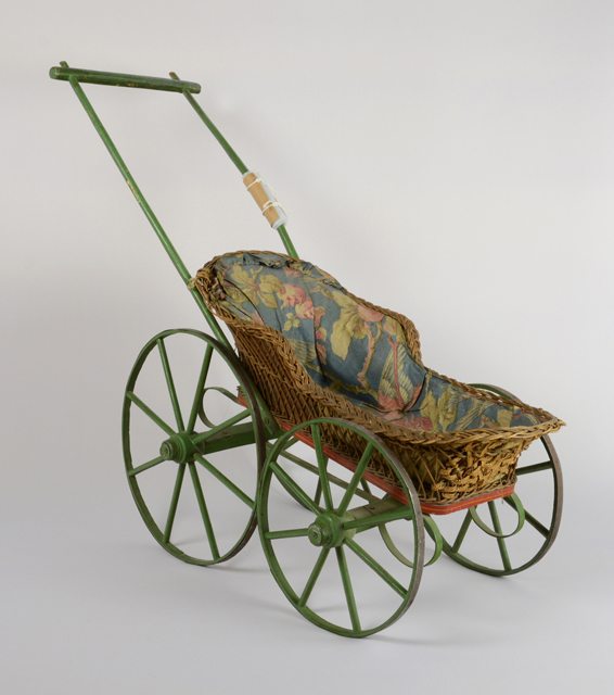 Poussette de poupée avec les roues et le manche en bois peints en vert, le panier du siège est en rotin et est installé sur une base en bois rouge. Le panier est recouvert de tissu à motifs d’oiseaux et de fleurs. Un renfort en jonc (?) est attaché au panier à l’avant du carrosse. Les roues sont doublées d’un cerceau en métal. Le manche est cassé à gauche.