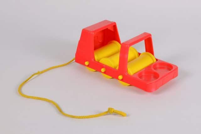 Camion en plastique rouge muni de trois rouleaux de plastique jaune comme roues et deux enfoncements circulaires à l’arrière pour insérer des personnages ou autres objets.