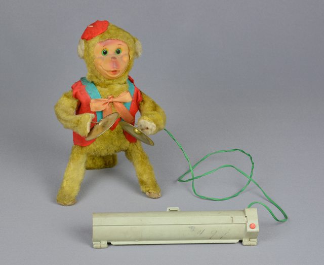 Singe jouet mécanisé appuyé sur ses pattes arrière et sa queue. Il porte une veste rouge au col bleu avec une boucle orange et un béret rouge. Le visage du singe est en plastique et les traits sont peints. Il y a des cymbales dans ses mains. Un fil vert relie l’épaule droite du singe à un bloc d’alimentation de forme cylindrique en plastique gris avec un bouton rouge. Sous le jouet, il y a une étiquette ronde blanche.