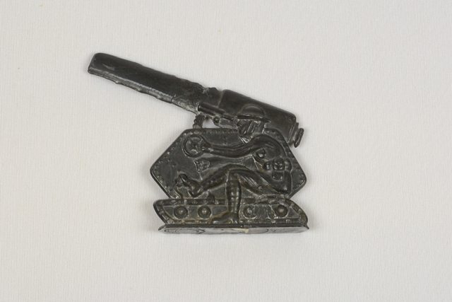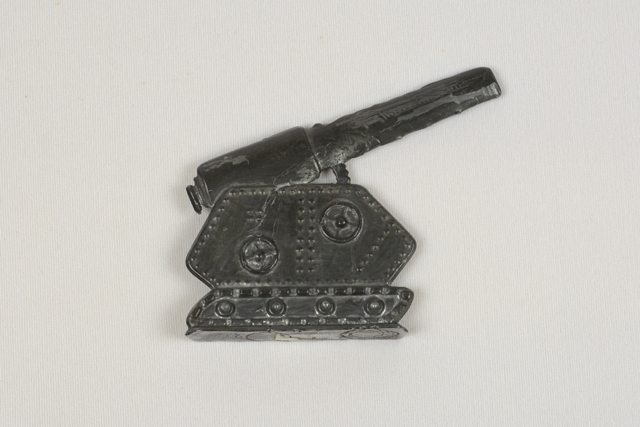Jouet représentant un soldat assis sur la chenille d’un char d’assaut, opérant un canon.