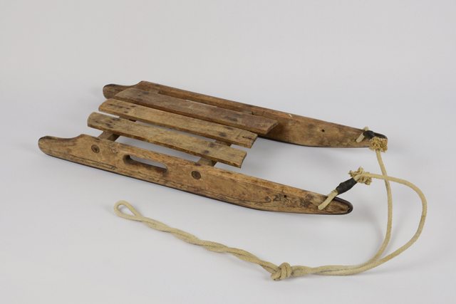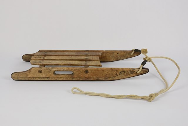 Petit traîneau en bois avec corde attachée à l’avant des patins. Un interstice de chaque côté sur les patins vis-à-vis la selle permet à l’enfant de se tenir. La selle est composée de trois planches de bois fixées à deux pièces de bois reliant les patins au traîneau. Sur les côtés extérieurs des patins, on retrouve des motifs de fleurs suivant deux lignes le long des patins. La tranche des patins est recouverte d’une tige de métal.