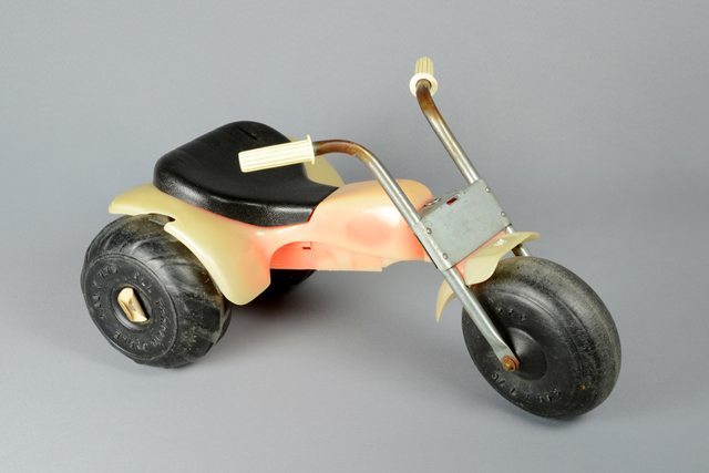 Tricycle sous la forme d’un tout-terrain à trois roues pour enfant en plastique. Le corps est en plastique décoloré avec des teintes de rose et de beige. Le siège et les roues sont en plastique noir. La fourche tenant la roue avant est en métal gris avec des poignées en plastique beige.