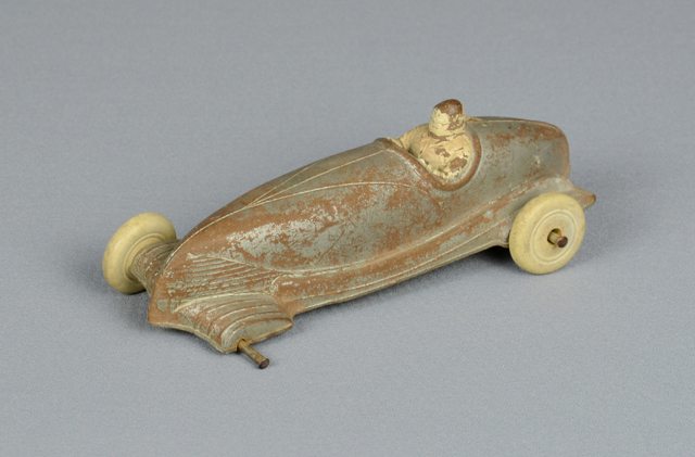 Petite voiture de couleur gris acier avec les roues blanches. À l’arrière du véhicule, le conducteur peint en beige porte un casque et un foulard.