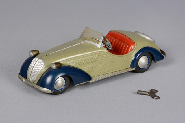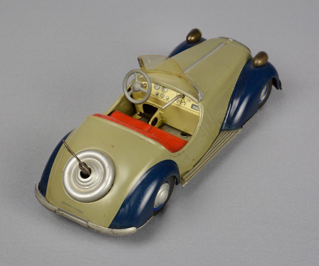 Voiture jouet de type cabriolet sport des années 1940. Elle est munie d’un mécanisme à remontoir à l’arrière où se trouve la roue de secours. Une tige se trouve au milieu de la fausse roue sur laquelle est insérée une clé. Le parebrise est en plastique transparent. La cabine comprend un volant gris faisant tourner les roues avant, un levier de vitesse de couleur métallique et un levier de mise en action noir. La voiture est de couleur verte, les ailes sont bleu foncé et la banquette est rouge.